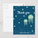 Cartão de agradecimento adorável com cores neutras e tema submarino. Perfeito como agradecimento para chá de bebê ou para marketing de negócios. A ilustração da pequena água-viva verde com coral ao fundo, peixes e estrelas é adorável. Este cartão-postal combina bem com o convite que você pode encontrar na minha loja. Personalize o texto com suas próprias informações. Ilustrado e projetado por Patricia Alvarez.