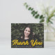 Cartão de agradecimento de formatura simples e elegante com a foto horizontal do formando com "Obrigado" em uma letra amarela em negrito. Personalize a frente do cartão de agradecimento de formatura com foto adicionando o nome do formando, o nome da escola e o ano de formatura. O verso do cartão exibe o endereço de retorno e a mensagem de agradecimento personalizada.