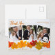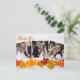 Este lindo cartão de agradecimento de casamento de Ação de Graças apresenta uma elegante colagem de 3 fotografias sob as palavras laranja Obrigado. Esta bonita fotografia de folhas de outono com madeira branca na moda por trás das folhas é um cartão de férias chique para decorar com suas fotografias de recém-casados. Agradeça por seu novo casamento com essas fotos de casal fofas.