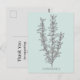 Um cartão postal para dar aos clientes para agradecê-los por seus negócios decorado com erva de alecrim em um tom quente de cinza em um fundo turquesa claro. No verso há um tom suave de cinza e texto que você pode editar para atender às suas necessidades.