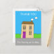 Uma casa de desenho animado e colorida e as palavras "Obrigado por nos ter para ficar".