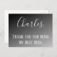 Mostre ao seu melhor homem o quanto você o apreciou no seu grande dia com este cartões de agradecimentos de casamento "Obrigado por ser meu Melhor Homem". Este obrigado personalizado que você faz o cartão-postal apresenta um design de gradiente preto com seu nome escrito em letras grandes brancas cursivas. Abaixo do nome está "Obrigado por ser meu melhor homem" escrito em impressão branco padrão. Personalize seu obrigado que você faz hoje!