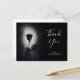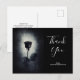 Um cartão postal de agradecimento de uma festa sombria e misteriosa com uma ilustração legal de uma rosa preta em estilo gótico/emo com sangue vermelho pingando de suas pétalas. Um fundo preto desgastado com uma cor creme no centro destacando essa rosa sombria e macabra.