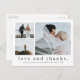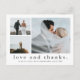 Uma simples foto de casamento de 3 fotos agradece o cartão de anotação, com imagens simples do tipo moderno e 3 fotos na frente. A parte traseira é um cartão postal endereçável com um cabeçalho de nome de cheio grande e uma mensagem pessoal do casal. Clique no botão editar para personalizar este design com suas fotos e detalhes.