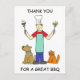 um homem está em um avental e chapéu de chef, segurando dois garfos longos com uma salsicha e uma perna de frango nas pontas. Aos seus pés senta um gato e um cachorro, olhando para a comida. As palavras "Obrigados para um CHURRASCO de excelente" estão à volta da imagem.