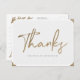 Mande seu amor e obrigados para sua dama de honra com nosso cartão postal dos obrigados modernos. O design apresenta "Obrigados" projetados em uma fonte moderna de script do estilo pincel em ouro falso. Os cantos de fotos dourados falsos são adicionados às bordas do cartão-postal. O verso apresenta xoxo e amor, com linhas de vazio adicionadas para escrever sua própria mensagem pessoal.