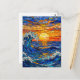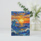 A postcard with an illustration of a stained glass mosaic ocean waves and sunset illustration.