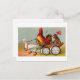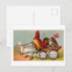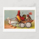 Este cartão-postal é uma reprodução de uma linha de costura de propaganda vitoriana de cartões comerciais antigos. Mostra um galo e galinha cavalgando em um carrinho puxado por um pato branco.