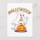 Um fantasma simpático sorrindo, com uma abóbora sorridente, que nos saúda para uma festa feliz.