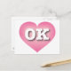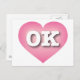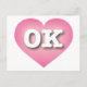 Este cartão-postal apresenta um coração calmo, legal e colecionado cor-de-rosa com um centro lavado em branco contendo as letras maiúsculas brancas e em negrito OK, a abreviação oficial para Oklahoma, o estado mais rápido. O reverso do cartão postal é vazio, aguardando seus sentimentos manuscritos ou texto personalizado.