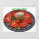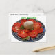 Este cartão postal de olá da Itália tem uma foto de um lindo prato azul e amarelo com comida italiana clássica. Tomates vermelhos fatiados fornecem um grande contraste de cor.