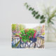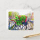 Este cartão postal apresenta uma cena do topo de uma ponte em Amsterdã, apresentando flores brilhantes e lindas, e bicicletas, que estão estacionadas ao longo da borda. Você pode ver edifícios ao fundo.