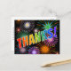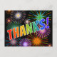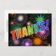 Este design de cartão postal de agradecimento animado apresenta a mensagem "OBRIGADO!", com as letras tendo um padrão de gradiente de espectro de arco-íris, sobre um fundo preto com um padrão colorido inspirado em fogos de artifício explosivos. A frente também apresenta o nome do remetente personalizado. O verso apresenta uma mensagem de agradecimento personalizada. Um cartão como este pode ser usado para agradecer a alguém que fez algo especial, ou que talvez tenha participado de um evento como um casamento, festa de aniversário de casamento ou festa de aniversário.