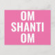 Este cartão-postal apresenta a transliteração do mantra sânscrito para invocar a paz - OM SHANTI OM - A branco num fundo cor-de-rosa.