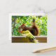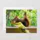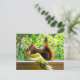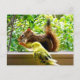 Um cartão-postal com uma fotografia de um pássaro amarelo escondido na janela observando um esquilo vermelho derrubando.