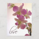 Orquídeas roxas suaves contra um fundo creme com amor na letra do script. Cartão postal perfeito para chás de casamento, salve a data, os anúncios de noivado e muito mais.