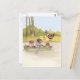 Uma galinha e um pintinho em terra observam como três coelhos flutuando a jusante em um barco a remo numa ilustração vintage de um livro infantil de 1921.