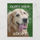 Este cartão-postal apresenta uma fotografia de um feliz cão que recupera o ouro, juntamente com a citação, "Não compre, Adote." Perfeito para grupos de resgate de cães e salvadores individuais.