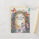 Um coelho sentado no caminho da floresta juntando ovos coloridos de Páscoa. Texto da família ou amigo no verso.