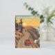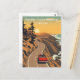 Faça um passeio panorâmico ao longo da icônica Pacific Coast Highway da Califórnia com este cartão postal de viagem em estilo retrô. Com estradas sinuosas ao longo de penhascos dramáticos, um conversível em movimento e o Oceano Pacífico ao pôr do sol, esta ilustração captura o espírito da viagem de carro americana definitiva. Um item obrigatório para colecionadores e amantes de viagens.