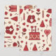 Este padrão de desenho apresenta uma variedade de elementos desenhados à mão em uma paleta quente de vermelhos e rosas suaves, incluindo:
