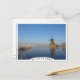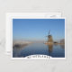 Cartão-postal de uma paisagem no campo dos Países Baixos com um moinho de vento, gelo no rio e foscos, sob um céu azul claro, com uma borda branca, e a preto o texto curvo "Países Baixos".
