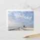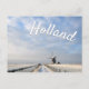 Cartaz fotográfico de uma visão minimalista de uma paisagem de inverno na Holanda com um percurso e um canal em direção a um moinho de vento sob uma camada de neve com nuvens agradáveis ao nascer do sol no campo holandês com o texto "Holanda".