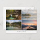 Cartão postal com paisagens com igrejas na zona do famoso lago Bled e lago Bohinj e Vintgar Gorge, com uma fronteira branca, e o texto: "Eslovênia".