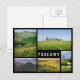 Cartaz colado de várias paisagens com ciprestes, vilas e famosas estradas brancas (strade bianche) no Vale de Val d'Orcia, na Toscana, com um quadro negro, e o texto: "Toscana".