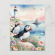 "pássaros puffin", "pufinas negras e brancas", "farol vermelho", "ilustração de pintura de aquarela", "paisagem marinha marinha", "ave bonitinha da costa marinha", "lindos animais pintados", "flores florais pastel florais", "verão primavera brilhante colorido", "vida selvagem de verão"