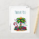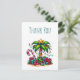 Cartão de agradecimento com uma imagem sazonal de feriado. Uma palmeira tropical decorada com luzes festivas com uma estrela no topo. Um enorme bastão de doce vermelho e branco saindo da areia. Presentes de Natal sob a árvore. Caprichoso e divertido.