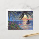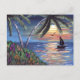 Duas palmeiras costeiras e um veleiro no oceano ao pôr do sol com aves e flores. Linda paisagem de pintura acrílica de paisagem de uma praia tropical Caribe. Original tradicional pintado à mão por Donna Leger para ©irony design
