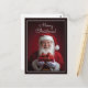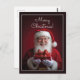 Um design festivo com Papai Noel segurando um presente belamente embrulhado, contra um fundo vermelho vibrante. O texto clássico "Feliz Natal" é exibido com destaque, acrescentando um toque alegre à composição. Esta design captura o espírito quente e alegre do Natal num estilo limpo e atraente.