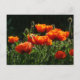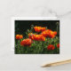 Cartão postal com foto de flores de papoula laranja iluminadas pelo sol contra um fundo escuro