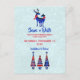 Cartão postal Save the Date com um fundo verde claro e branco com aparência de neve. Ilustrado com um par de cervos azuis escandinavos usando cachecóis vermelhos. Com marcações decorativas em seus corpos. Uma tríade de árvores de natal em estilo nórdico em azul e vermelho com estrelas no topo, abaixo do texto.