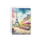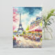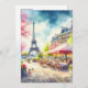 Este postal apresenta um retrato aquoso da Torre Eiffel em Paris, França.