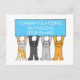 Quatro gatinhos de desenho animado segurando um cartaz de turquesa que diz "Parabéns de aprovação nos seus exames".