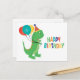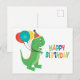 Ilustração fofa de um dinossauro segurando três balões e usando um chapéu de festa de aniversário!