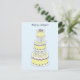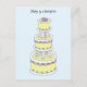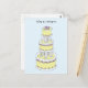 Um bolo de casamento de na moda multi-hierarquizada, colocado sobre um fundo azul pálido. As palavras Hoje e Forever são escritas em espanhol acima da imagem do bolo.