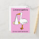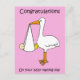 Uma cegonha de desenho animado segurando um bebê em uma folha, que pende do bico. A imagem tem um fundo cor-de-rosa pálido e é acompanhada pelos Parabéns das palavras no seu dia de nomeação do bebê'.