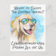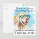 Cartão de congratulações de aposentadoria fofo e moderno com um golden retriever engraçado em uma praia tropical. Design original criado a partir de uma de nossas aquarelas pintadas à mão.