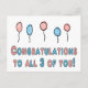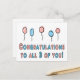 Um divertido design de parabéns pela gravidez mostra a mensagem "parabéns aos 3!" com alguns balões desenhados à mão acima - tudo em cores rosa e azul.