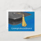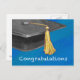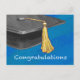 Você ou alguém que você conhece está se formando! Sim! Envie suas parabéns com nosso design na moda apresentando nossa arte original de um boné de formatura azul com uma fita amarela contra um fundo preto texturizado e a palavra, Parabéns no fundo. Designs personalizados disponíveis.