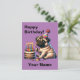 Este cartão de aniversário encantador e personalizável apresenta um adorável pug como a estrela do show. O pug é representado em uma ilustração realista, mas estilizada, sentado pacientemente ao lado de um decadente bolo de chocolate adornado com uma vibrante seleção de velas de aniversário acesas. Com seus olhos largos e expressivos, o pug está usando um chapéu de festa festivo, adicionando ao clima de celebração do cartão.