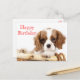 Este cartão-postal canino divertido apresenta uma imagem de um cachorrinho branco e castanho Cavalier King Charles Spaniel com suas patas em uma borda de cesta de madeira realçada contra um fundo branco nítido com Happy Birthday impresso em uma fonte vermelha e arrojada.