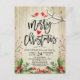 Flores do texto, da poinsétia da tipografia, ramo de pinheiro e bagas vermelhas do visco no fundo de madeira rústico.