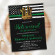 Convites à Reforma Militar da Linha Verde fina. Celebre anos de serviço dedicado, sua aposentadoria militar e convide amigos e familiares para o seu partido militar com esta bandeira verde fina russa com Dourado Convite à Reforma Militar do Exército. DESIGN americano na bandeira da Polícia, cores, branco verde-preto vestido e design de ouro. Este convite à reforma militar é também perfeito para a graduação militar, para o soldado que vai embora parte, para destacamentos e para o regresso a casa, para mudar de local na personalização. Veja nossa coleção para combinar presentes de aposentadoria militar, favoritos para festas militares de aposentadoria e suprimentos. COPYRIGHT © 2021 Judy Burrows, Black Dog Art - Todos Os Direitos Reservados. Cartão postal de Convite de festas de aposentadoria de bandeira fina da linha verde militar