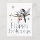 Cartão postal de férias de inverno sofisticado com a imagem de um passarinho fofo que se senta em um galho de pinheiro e se prepara para comer algumas frutas vermelhas cobertas com neve fresca de inverno. O texto decorativo Feliz Férias está localizado abaixo da imagem, e flocos de neve de cor prateada estão voando em torno da imagem. Envie seus votos mais sinceros e calorosos para sua família, parentes e amigos. Você pode transferir este design para vários outros produtos, incluindo ímãs, cartões, pôsteres, quebra-cabeças. Este design é personalizável. Você pode alterar a imagem. Se desejar alterar o tamanho da imagem ou recompô-la em um produto escolhido, sinta-se à vontade para usar o botão "Editar Design" ou "Personalizar" (conforme o caso) de cor azul. Você será transferido para a "Ferramenta de Design" onde você pode alterar o tamanho, realocar imagens no painel do menu direito e adicionar texto no painel do menu esquerdo. Basta ser criativo