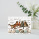 Um grupo de cinco pássaros robin europeus sentam-se em um galho acima de sete ovos azuis e manchados com nomes de cidades francesas antigas e endereços ao fundo.