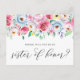 Você será minha irmã de honra? Cartão plano da irmã floral de honra colorida. Apresenta a terra floral de cor d'água de peões e rosas cor-de-rosa e azuis com caligrafia moderna. Personalize adicionando nomes e mensagens.